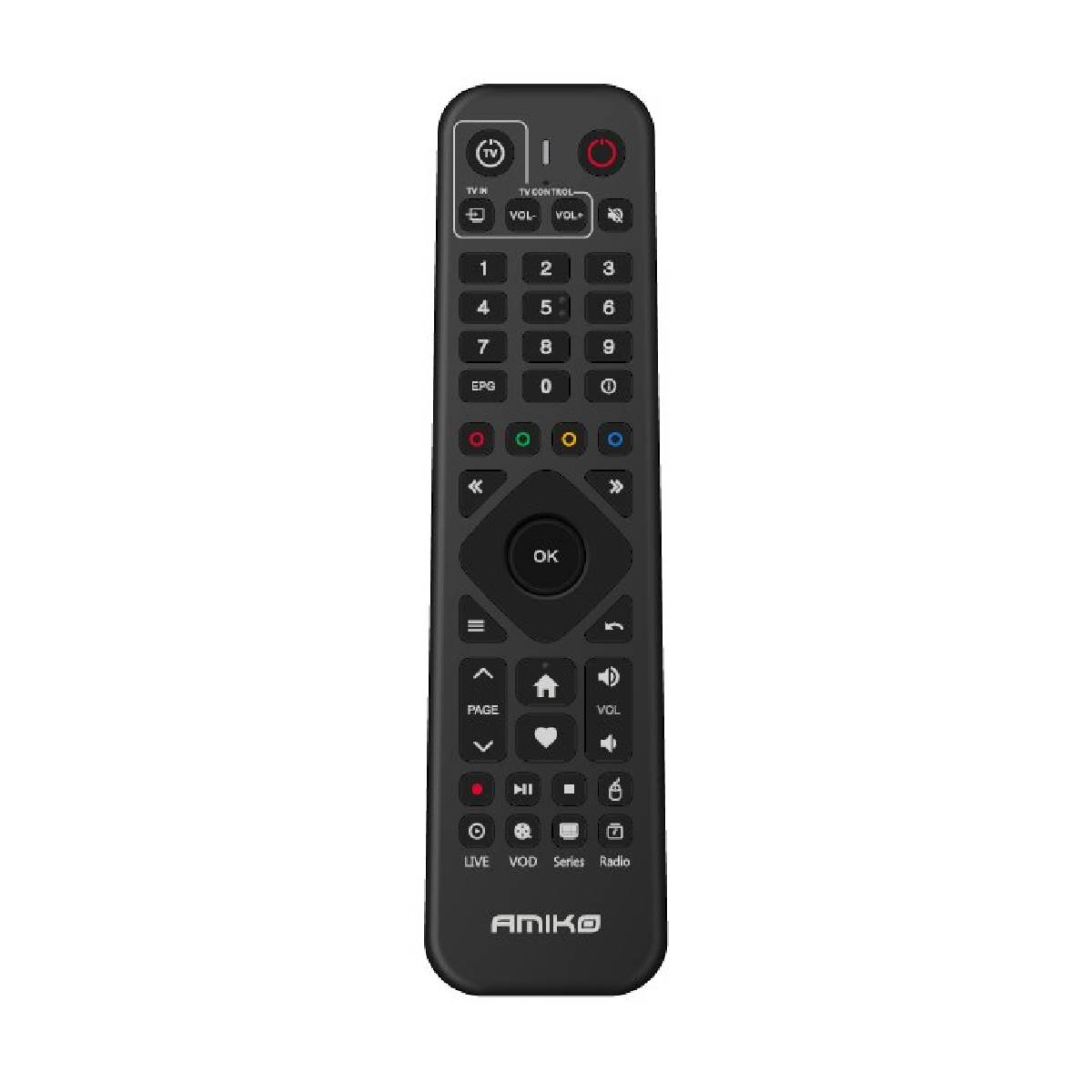 Náhradný IR diaľkový ovládač k Android prijímačom Amiko A4/A5/A6/A9 s možnosťou naprogramovať ovládanie TV (zapnutie/vypnutie, hlasitosť +/- a voľba vstupu)