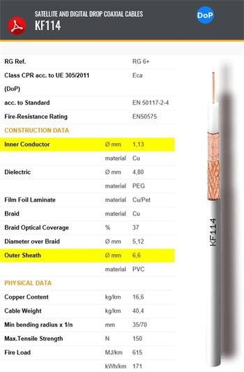 CAVELkód KF114 KONŠTRUKČNÉ VLASTNOSTI Vnútorný vodič priem. mm 1,13 materiál Cu Dielektrikum materiál PEG priem. mm 4,8 Tienenie 1. Povrch laminátovej fólie materiál Cu/Pet
