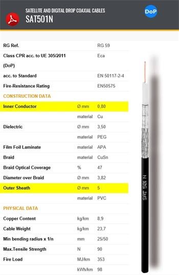 CAVELkód SAT501 KONŠTRUKČNÉ VLASTNOSTI Vnútorný vodič priem. mm 0,80 materiál Cu Dielektrikum materiál PEG priem. mm 3,5 Tienenie 1. Povrch laminátovej fólie materiál APA