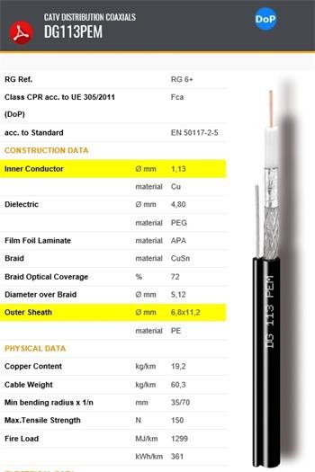 Koaxiálny kábel PE vonkajší CAVEL DG113 PEM 6,8mm ClassA+ závesný čierny