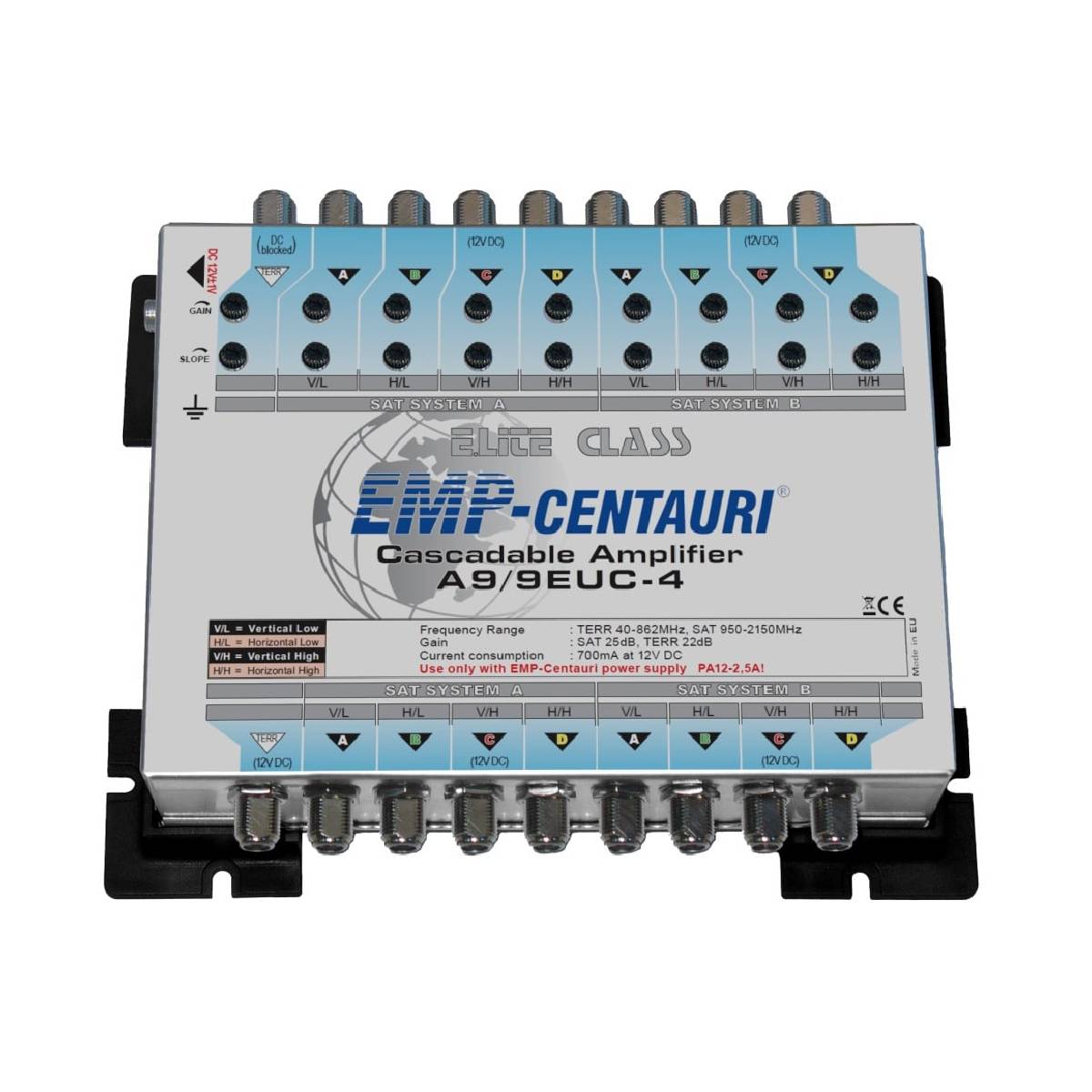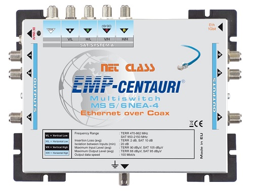 Multiprepínač EMP-Centauri MS5/60 EEU-13 je samostatný pre distribúciu pozemných a satelitnych signálov z 1 satelitnej pozície (4 polarizácie) pre 60 účastníkov.