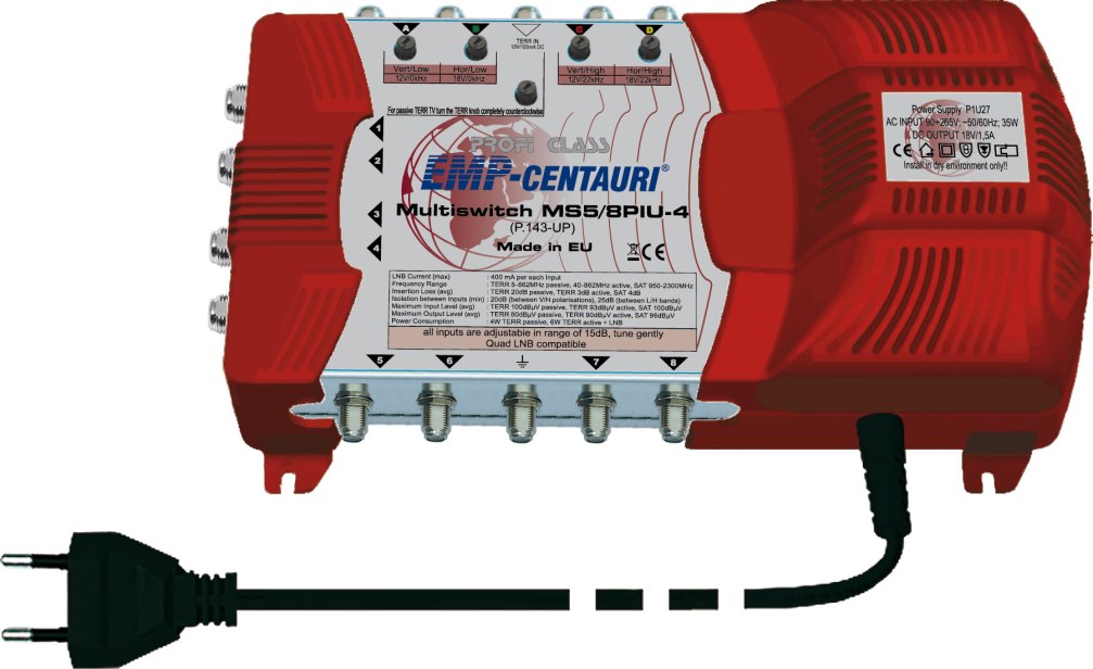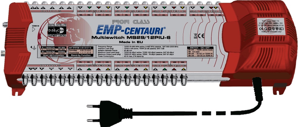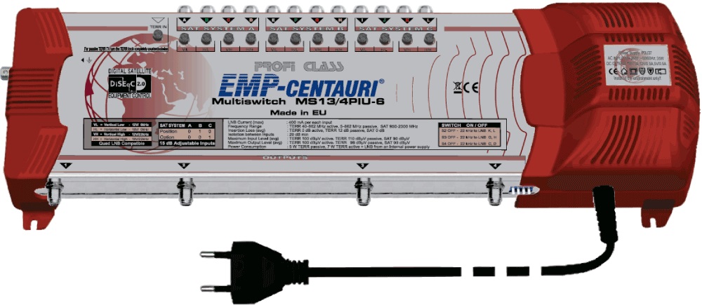 Multiprepínač EMP-Centauri MS5/60 EEU-13 je samostatný pre distribúciu pozemných a satelitnych signálov z 1 satelitnej pozície (4 polarizácie) pre 60 účastníkov.