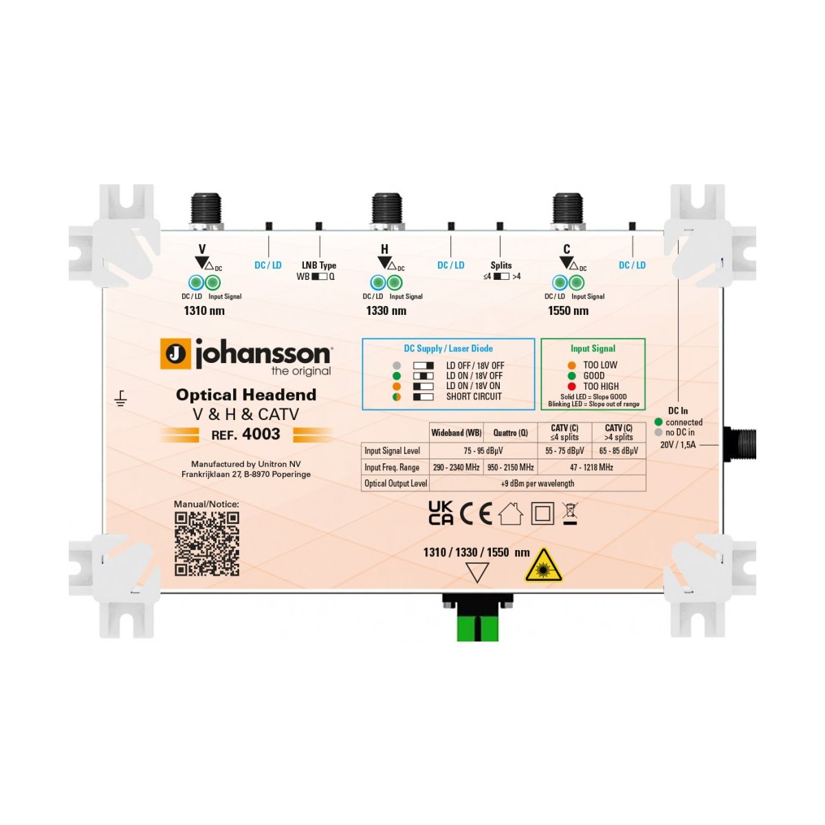 Optický vysielač konvertuje RF vstup do optiky(2x WideBand + 1x CATV), 40 - 2340MHz, vlnová dĺžka 1310/1330/1550nm