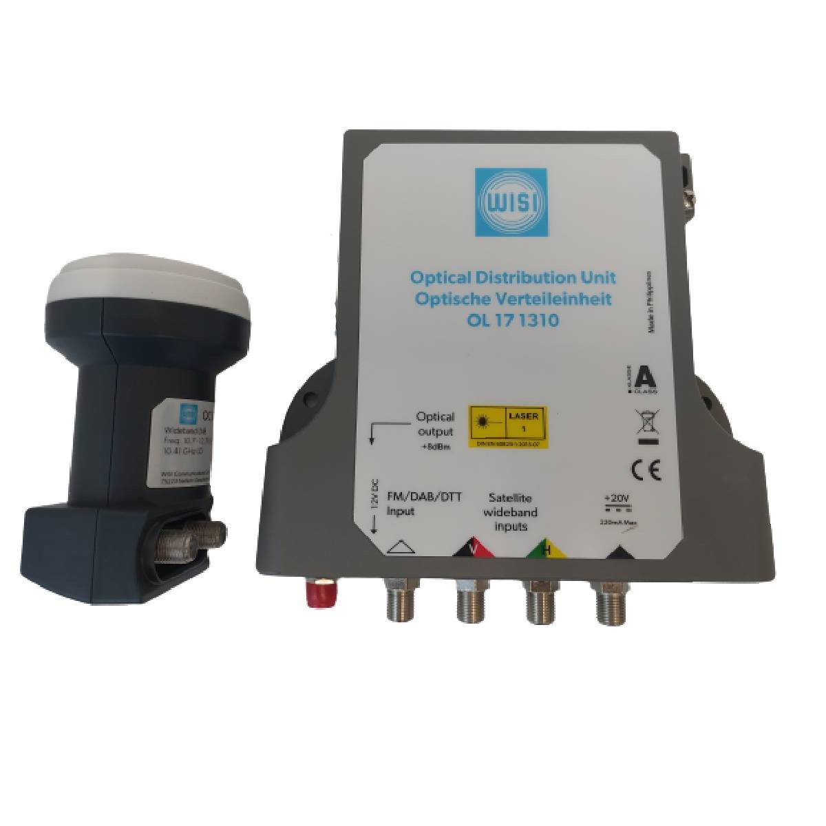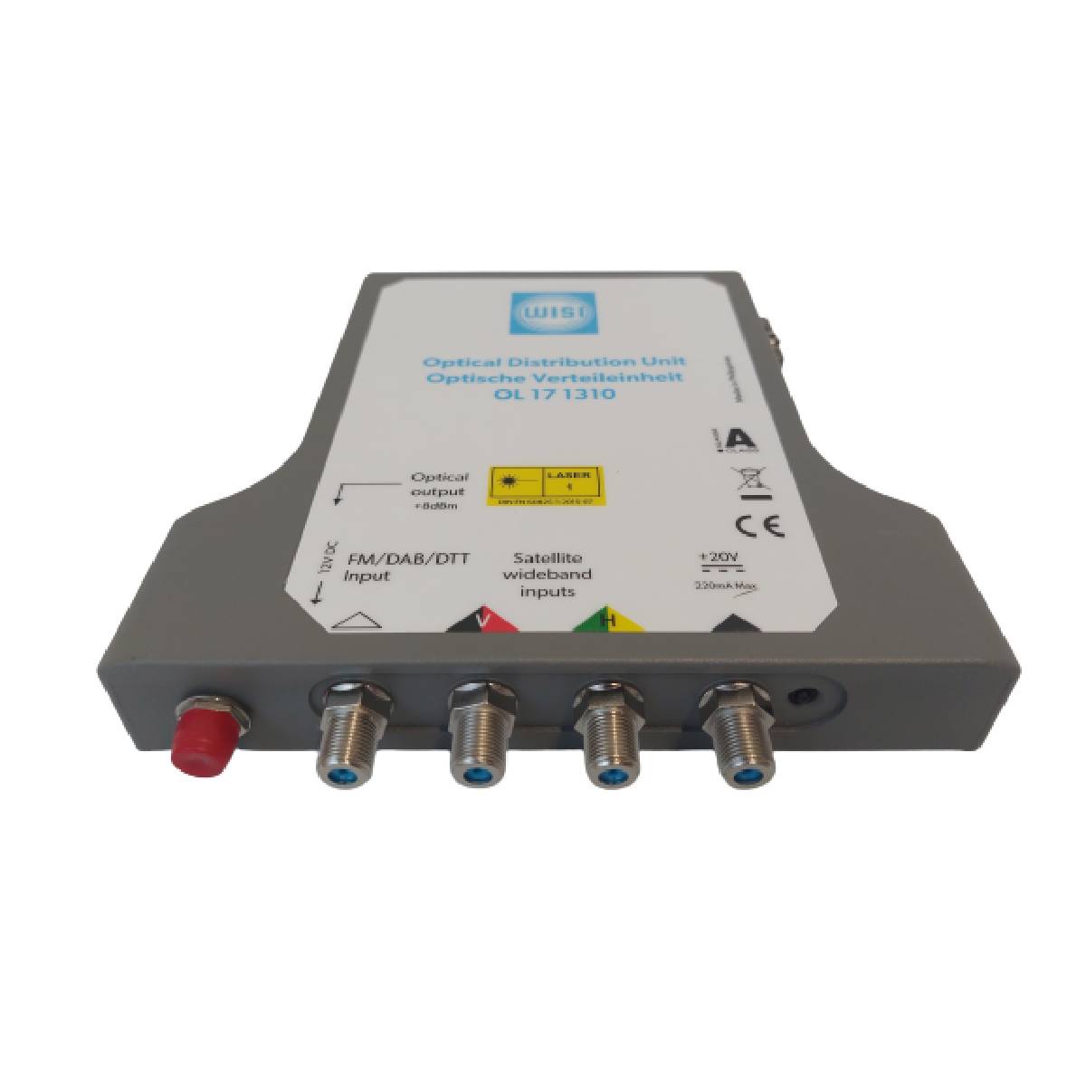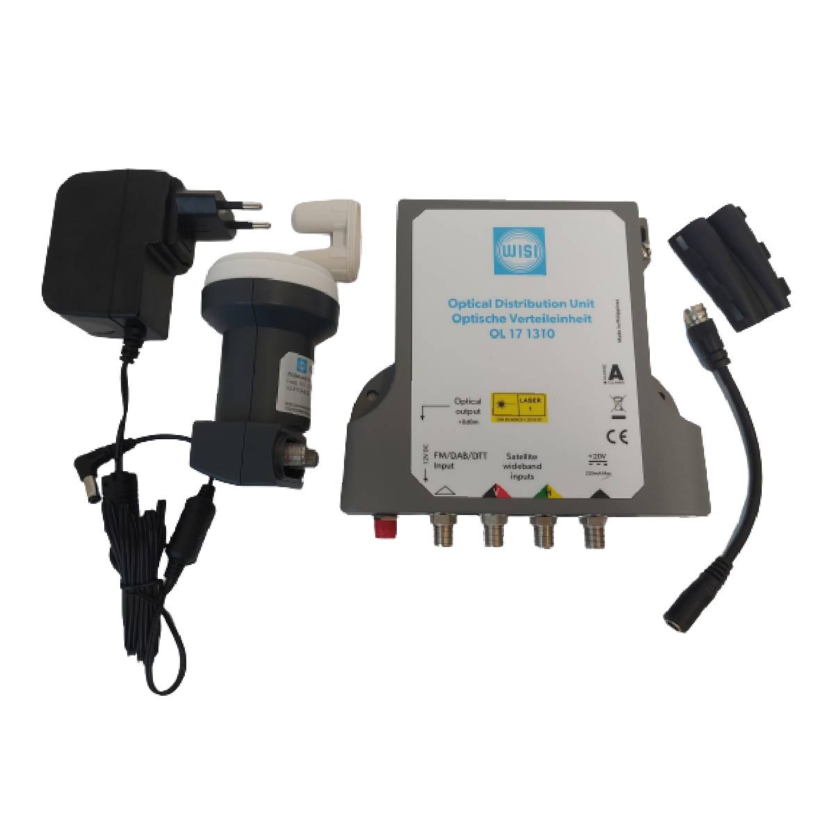 WISI optický prevodník QUAD OL 21 0003 pre použitie v optických rozvodoch satelitného signálu. Napájať môžete cez pripojené zariadenia, alebo cez externý napájací zdroj WISI 20V/1,2A pozrite nižšie "Súvisiace produkty".