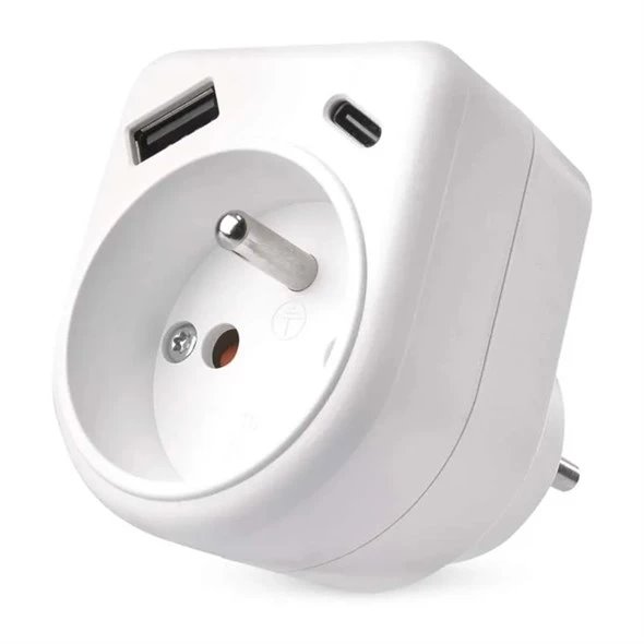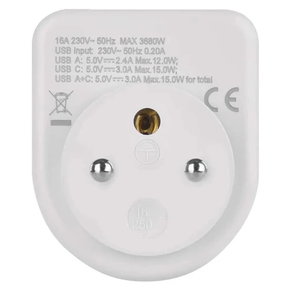 Kvalitný adaptér s 1 zásuvkou a 2 USB konektormi. Maximálne zaťaženie 3 680 W (250 V, 16 A) umožňuje pripojenie niekoľkých zariadení vo vnútornom prostredí.