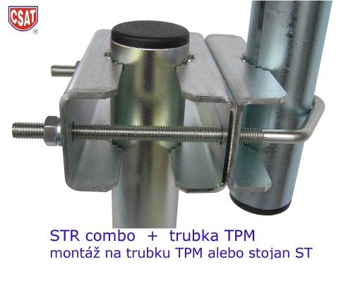 strmeň STR combo je určený pre bežné, jednoduché aplikácie kde sa vyžaduje spoľahlivé a mechanicky pevné uchytenie trubky na stožiar ( dve trubky navzájom), je ale určený predovšetkým pre zvýšenie pracovnej výšky stožiara.