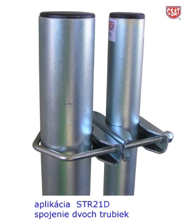 strmeň STR21D je určený pre bežné, jednoduché aplikácie, kde sa vyžaduje spoľahlivé a mechanicky pevné uchytenie trubky na stožiar (dve trubky navzájom), je ale určený predovšetkým pre zvýšenie pracovnej výšky stožiara.
