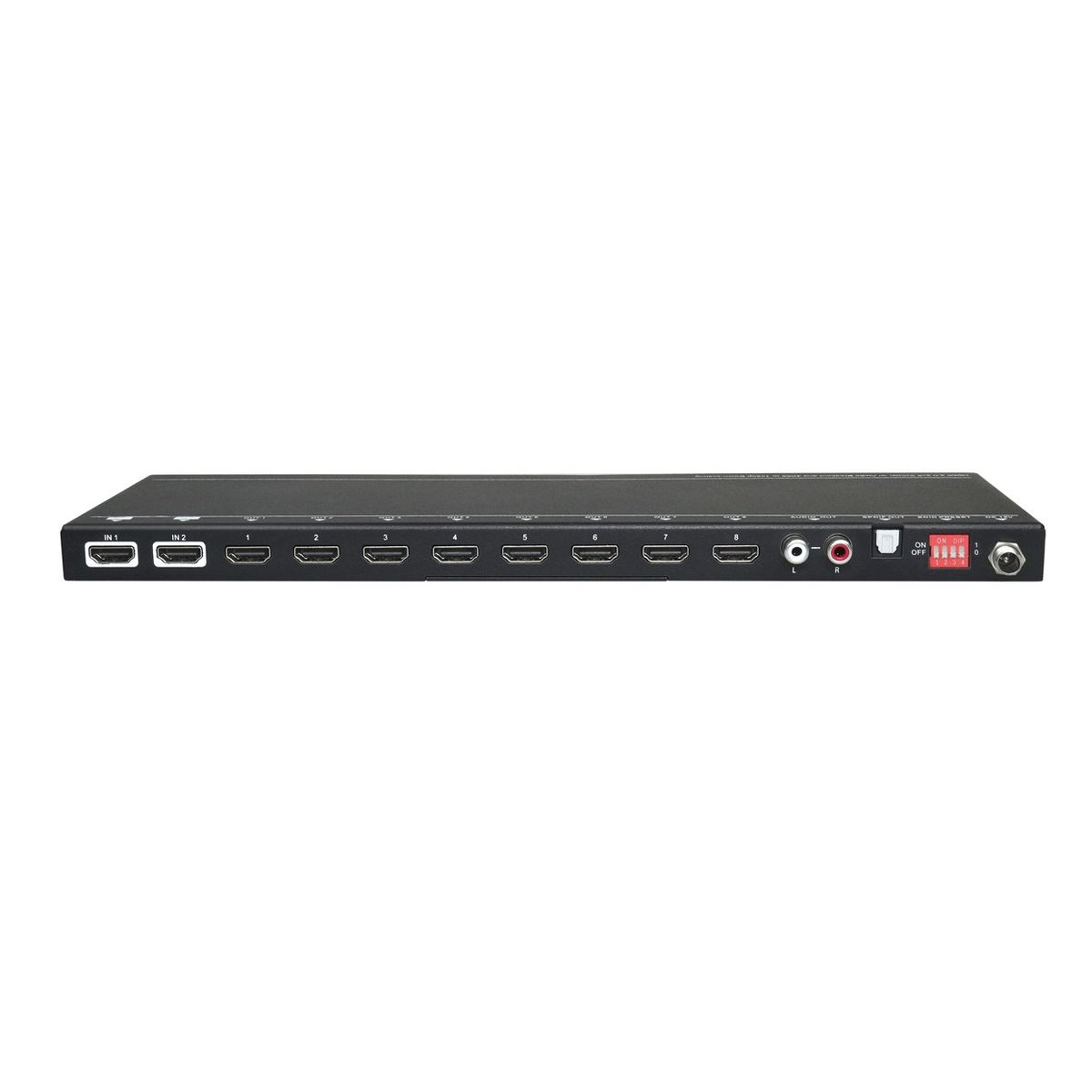 8 výstupový HDMI splitter s 2 zdrojmi signálu.Podpora HDMI 2.0, kompatibilný s HDCP 2.2. Digitálny TOSLINK a analógový L + R výstup. Vstavaný ekvalizér signálu umožnuje použitie dlhého HDMI kábla. Nastavenie EDID.